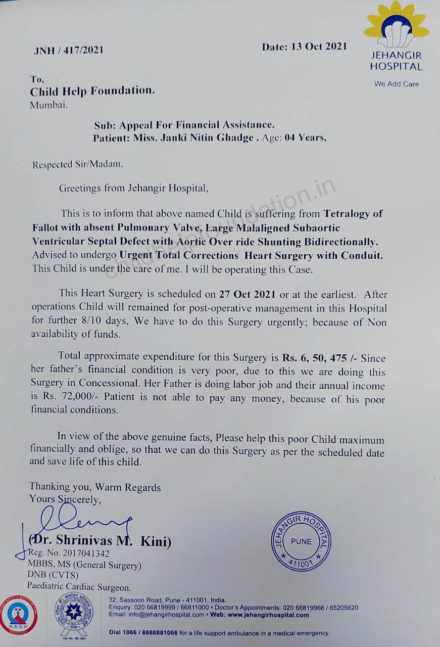 Janki’s parents are always worried as she often gets flue where she takes a long time to recover. She was taken to the doctor. After all the medical tests it was observed that she was suffering from heart disease. The doctor suggested that the Janki has to undergo heart surgery. Her treatment is going on in Jehangir hospital, Pune. The cost of her surgery is Rs. 6,50,475/- (rupees Six lakh fifty thousand four hundred and seventy-five only).